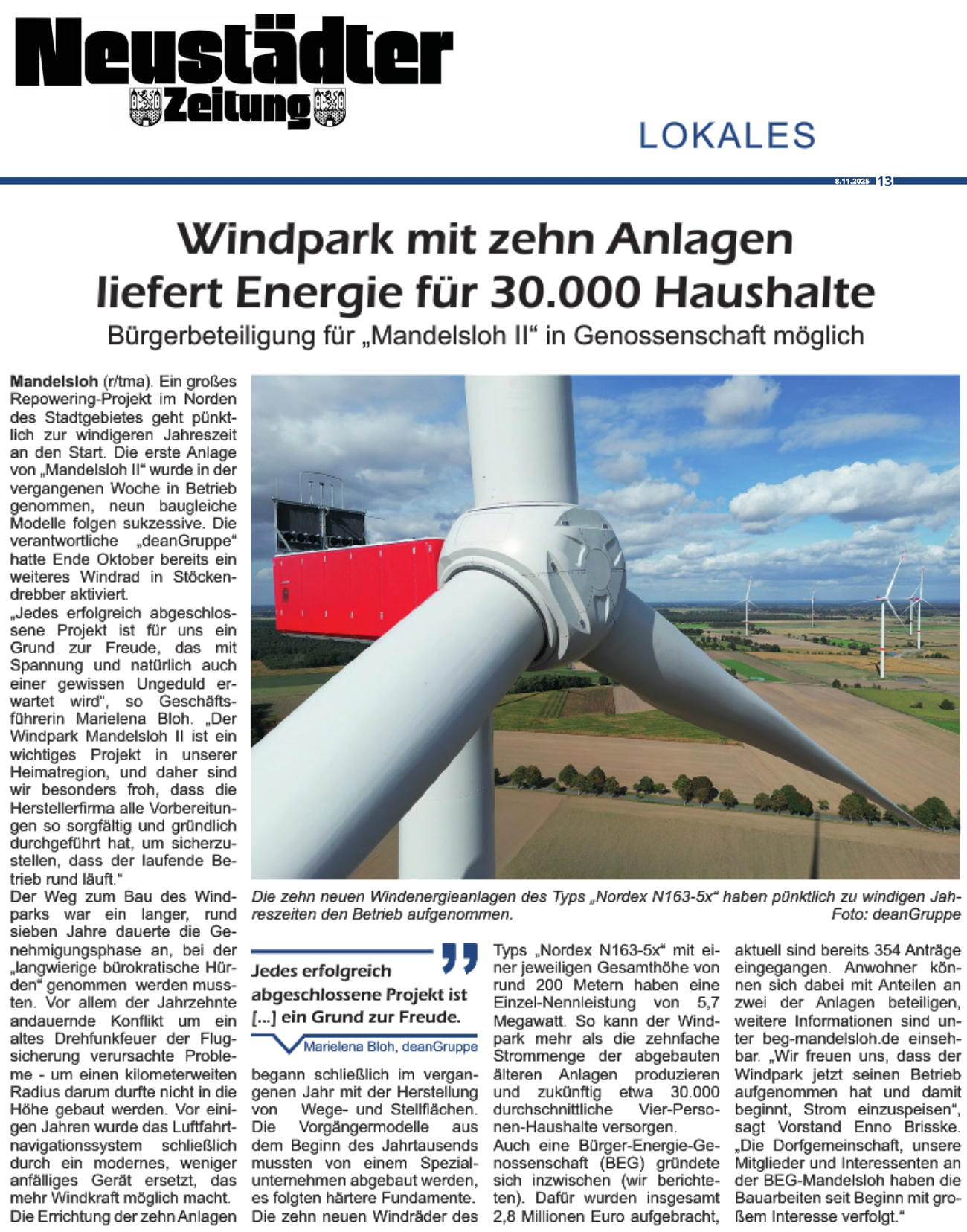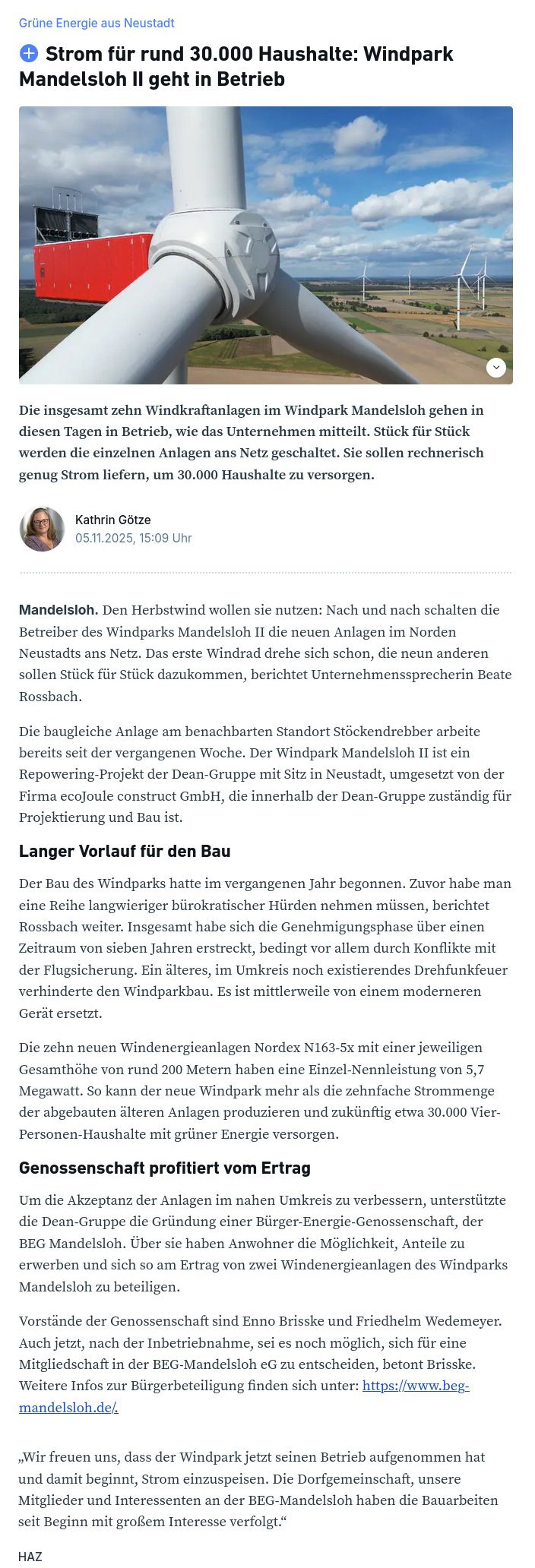 Presse 2025-11-15 Windpark Mandelsloh II hat seinen Betrieb aufgenommen mehr... Quelle: Schwarmstedter Rundschau 15.11.2025 2025-11-08 Windpark mit 10 Anlagen liefert Energie für 30.000 Haushalte Bürgerbeteiligung für "Mandelsloh II" in Genossenschaft möglich mehr... Quelle: Neustädter Zeitung 08.11.2025 2025-11-06 Strom für rund 30.000 Haushalte Windpark Mandelsloh II ist ans Netz gegangen mehr... Quelle: DIE HARKE 06.11.2025 2025-11-05 Strom für rund 30.000 Haushalte Windpark Mandelsloh II geht in Betrieb mehr... Quelle: HAZ.de 05.11.2025 2025-02-01 Schwarmstedter Rundschau Bürger können sich am Windpark beteiligen mehr... Quelle: Schwarmstedter Rundschau 01.02.2025 2025-01-30 Windpark Mandelsloh Genossenschaft verdient mit mehr... Quelle: HAZ / Leinezeitung 30.01.2025 2025-01-29 Windpark Mandelsloh Genossenschaft verdient mit mehr... Quelle: HAZ.de 29.01.2025 2025-01-17 Neustädter Zeitung Genossenschaft kann zwei Windräder finanzieren mehr... Quelle: NZ-Online vom 17.01.2025 2024-06-30 Flugsicherung lenkt ein: Mehr Platz für Windräder in der Region Hannover mehr... Quelle: NP-Online vom 30.06.2024 2024-06-07 Repowering im Nordkreis: Alte Windkraftanlagen werden abgerissen mehr... Quelle: NZ-Online vom 07.06.2024 2024-06-07 Windpark Mandelsloh Rückbau hat begonnen mehr... Quelle: NP-Online vom 07.06.2024 2024-03-08 Windpark Mandelsloh So sollen Dorfbewohner und Vereine von Erträgen profitieren mehr... Quelle: NP-Online vom 08.03.2024 2024-03-01 Frischer Wind aus Mandelsloh: deanGruppe informiert zu Windpark-Zukunft mehr... Quelle: NZ-Online vom 01.03.2024 2024-02-28 Stärke Windräder für Mandelsloh: Betreiber informiert über Pläne für Repowering mehr... Quelle: HAZ-Online vom 28.02.2024 2023-05-24 Windenergie in Suttorf und Mandelsloh deanGruppe stellt ihr Pläne vor mehr... Quelle: HAZ-Online vom 24.05.2023 2022-12-05 Nach Vergleich vor Gericht: Windpark wieder im Genehmigungsverfahren mehr... Quelle: NZ-Online vom 05.12.2022 2022-01-07 Stau_bei_Windkraft_muss_sich_erst_auflösen: Energieunternehmer_ist_vorsichtig_optimistisch mehr... Quelle: HAZ-Online vom 07.01.2022