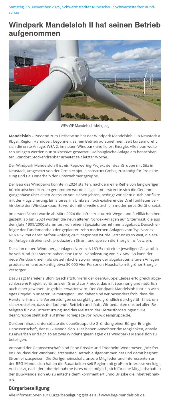 Presse 2025-11-15 Windpark Mandelsloh II hat seinen Betrieb aufgenommen mehr... Quelle: Schwarmstedter Rundschau 15.11.2025 2025-11-08 Windpark mit 10 Anlagen liefert Energie für 30.000 Haushalte Bürgerbeteiligung für "Mandelsloh II" in Genossenschaft möglich mehr... Quelle: Neustädter Zeitung 08.11.2025 2025-11-06 Strom für rund 30.000 Haushalte Windpark Mandelsloh II ist ans Netz gegangen mehr... Quelle: DIE HARKE 06.11.2025 2025-11-05 Strom für rund 30.000 Haushalte Windpark Mandelsloh II geht in Betrieb mehr... Quelle: HAZ.de 05.11.2025 2025-02-01 Schwarmstedter Rundschau Bürger können sich am Windpark beteiligen mehr... Quelle: Schwarmstedter Rundschau 01.02.2025 2025-01-30 Windpark Mandelsloh Genossenschaft verdient mit mehr... Quelle: HAZ / Leinezeitung 30.01.2025 2025-01-29 Windpark Mandelsloh Genossenschaft verdient mit mehr... Quelle: HAZ.de 29.01.2025 2025-01-17 Neustädter Zeitung Genossenschaft kann zwei Windräder finanzieren mehr... Quelle: NZ-Online vom 17.01.2025 2024-06-30 Flugsicherung lenkt ein: Mehr Platz für Windräder in der Region Hannover mehr... Quelle: NP-Online vom 30.06.2024 2024-06-07 Repowering im Nordkreis: Alte Windkraftanlagen werden abgerissen mehr... Quelle: NZ-Online vom 07.06.2024 2024-06-07 Windpark Mandelsloh Rückbau hat begonnen mehr... Quelle: NP-Online vom 07.06.2024 2024-03-08 Windpark Mandelsloh So sollen Dorfbewohner und Vereine von Erträgen profitieren mehr... Quelle: NP-Online vom 08.03.2024 2024-03-01 Frischer Wind aus Mandelsloh: deanGruppe informiert zu Windpark-Zukunft mehr... Quelle: NZ-Online vom 01.03.2024 2024-02-28 Stärke Windräder für Mandelsloh: Betreiber informiert über Pläne für Repowering mehr... Quelle: HAZ-Online vom 28.02.2024 2023-05-24 Windenergie in Suttorf und Mandelsloh deanGruppe stellt ihr Pläne vor mehr... Quelle: HAZ-Online vom 24.05.2023 2022-12-05 Nach Vergleich vor Gericht: Windpark wieder im Genehmigungsverfahren mehr... Quelle: NZ-Online vom 05.12.2022 2022-01-07 Stau_bei_Windkraft_muss_sich_erst_auflösen: Energieunternehmer_ist_vorsichtig_optimistisch mehr... Quelle: HAZ-Online vom 07.01.2022